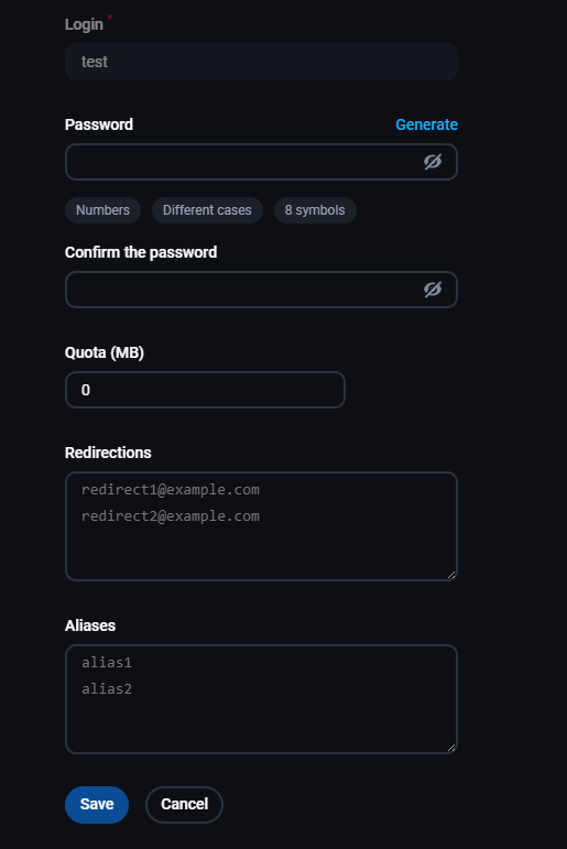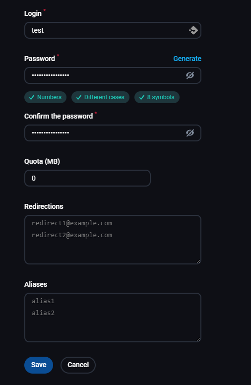 - Quota - unosite željeni limit za taj mail nalog u MB, a 0 znači neograničeno