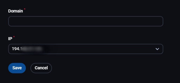 Klikom na +New domain otvoriće se stranica gde je potrebno uneti željeni domen i odabrati IP adresu (ukoliko ih imate više).