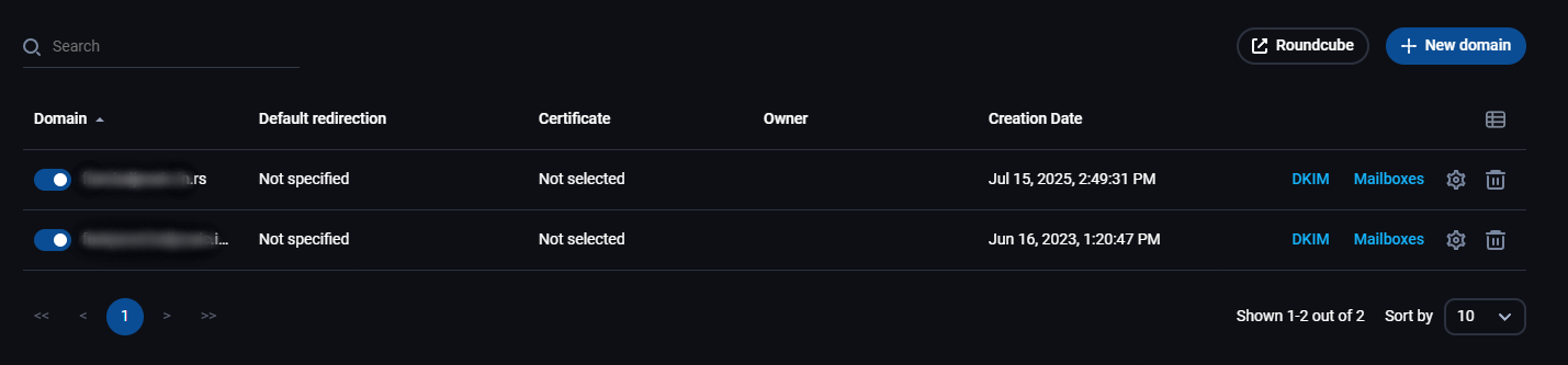 - + New Domain - služi za dodavanje novog domena na kom će postojati mail nalozi