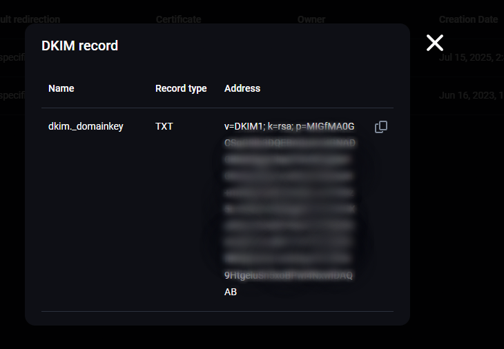 - DKIM - otvara pop-up prozor u kom se nalazi DKIM zapis koji je potrebno uneti u DNS zonu