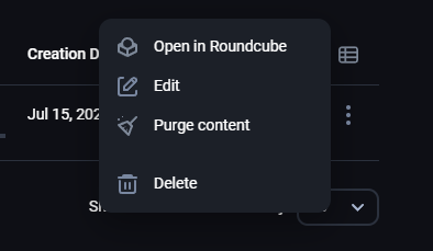 Nakon sačuvanih unetih podataka bićete vraćeni na prethodnu stranicu gde će biti izlistani svi mail nalozi do tada kreirani, a sa desne strane mail naloga imaćete dugme sa tri tačkice koje otvara sledeće opcije: