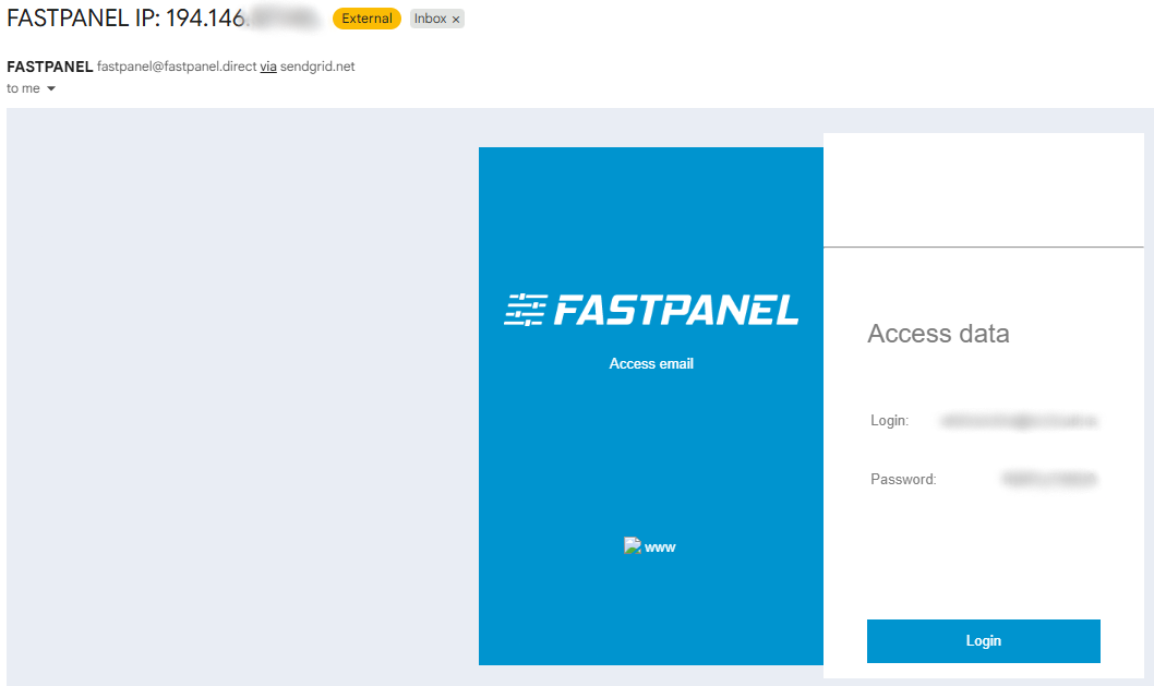 U samom naslovu videće se IP adresa servera, a u tekstu maila nalazi se mail adresa koja se koristi kao korisničko ime, lozinka kao i dugme Login koje vodi na login stranicu za FastPanel na vašem serveru (http://ip_adresa:8888).