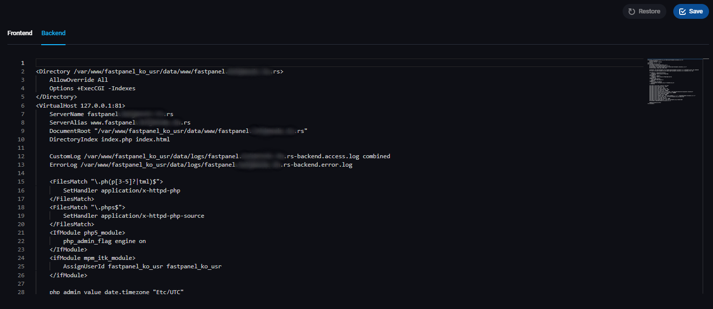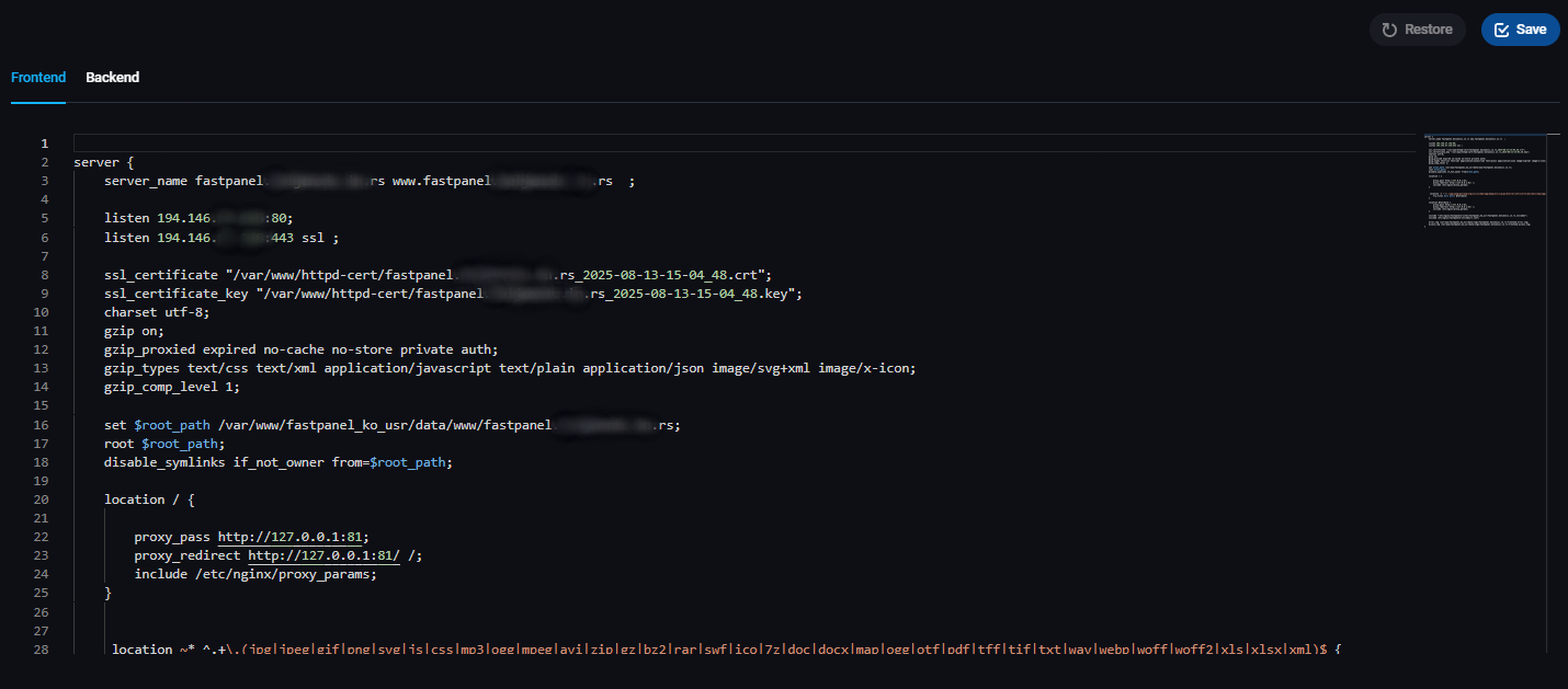 FastPanel za sajtove koristi kombinaciju nginx-a i apache-a, gde nginx služi kao reverzni proksi za apache. Ukoliko je potrebno da napravite izmene u konfiguraciji nekog od njih, to možete odraditi na način opisan ispod.
