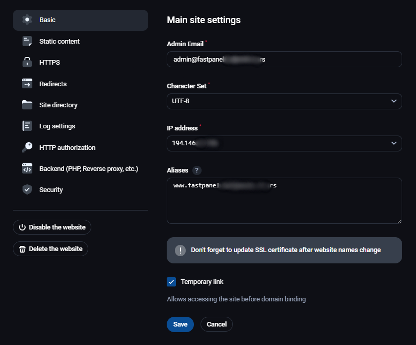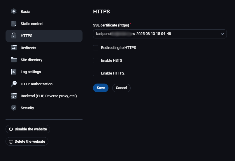 - SSL certificate (https) - birate SSL sertifikat iz padajućeg menija (automatski podešeno na validan SSL ako je izdat)