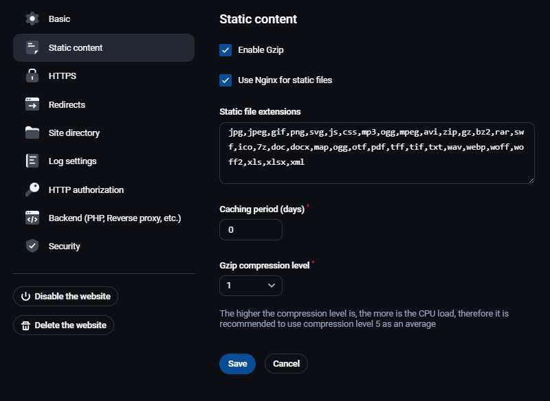 - Gzip compression level - nivo gzip kompresije od 1 do 9, veći nivo kompresije koristi i više resursa