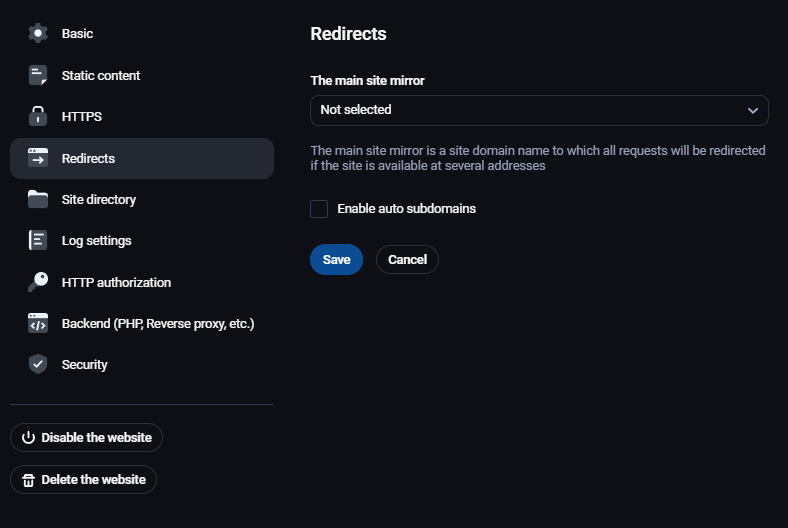 The main site mirror je opcija koja omogućava da odaberete na koji domen će se redirektovati sav sadržaj ukoliko isti sadržaj servirate na više domena.