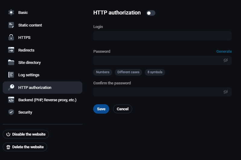 - HTTP authorization - podešavanje HTTP autorizacije (zaključavanje sajta)