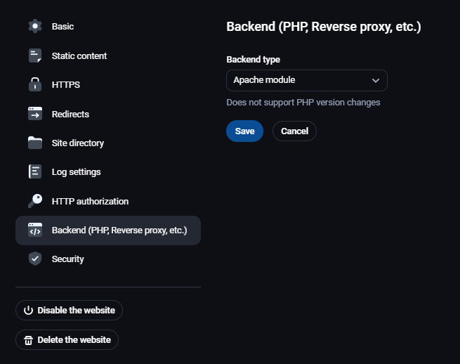 - Backend (PHP, Reverse Proxy, etc.) - backend podešavanja