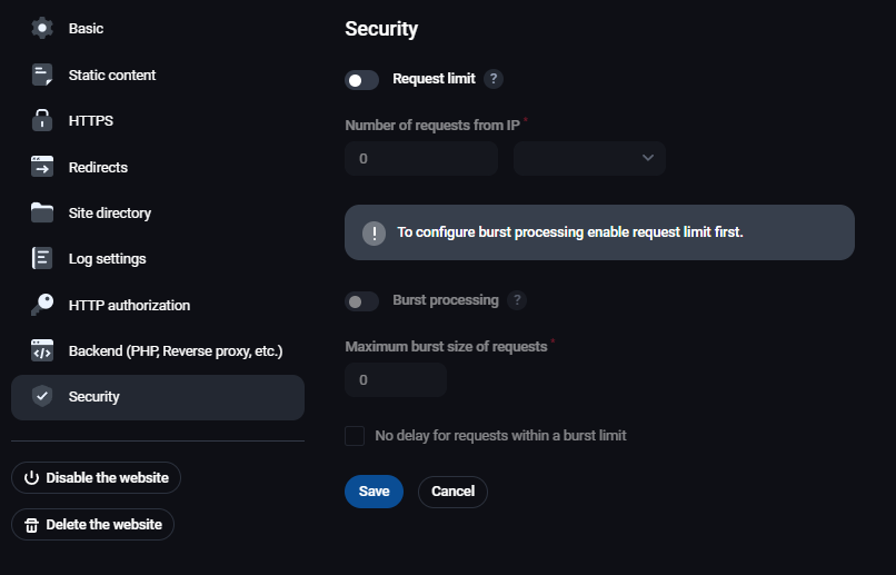 - Request limit - omogući ograničavanje broja zahteva po IP adresi