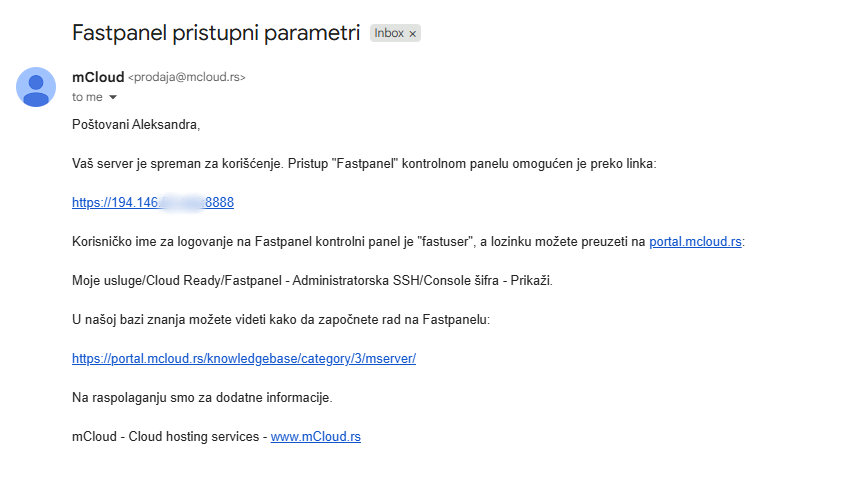 Nakon što se aktivirao server sa FastPanel-om, dobićete mail u kome će biti opisano kako da pristupite serveru: