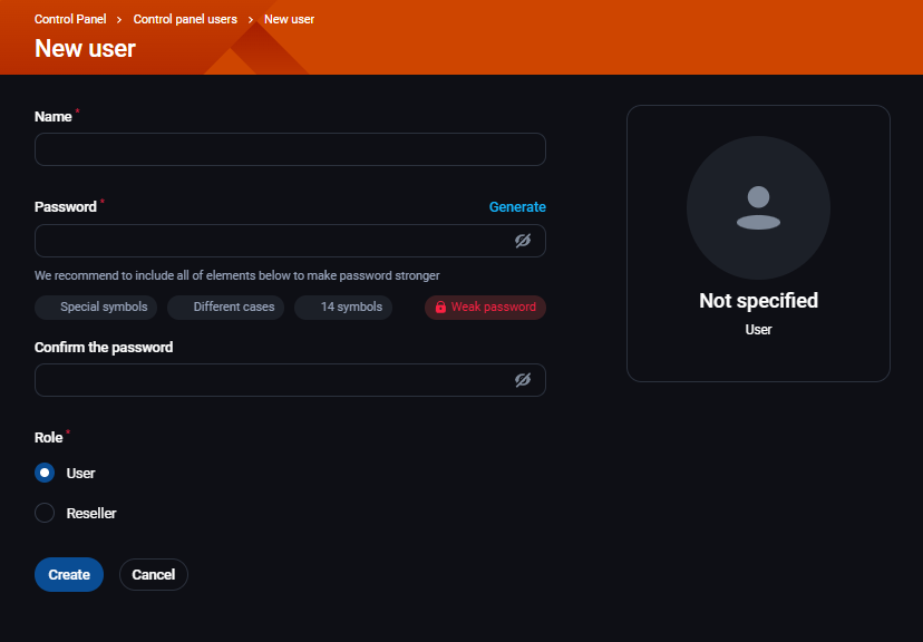 - Role - da li će biti običan korisnik (User) ili reseller