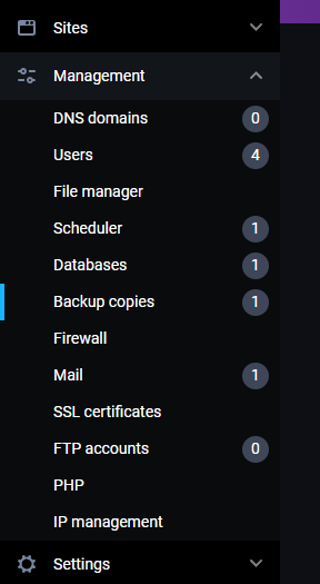 Za upravljanje backup-ima u FastPanel-u potrebno je da u meniju sa leve strane odaberete Management -> Backup copies: