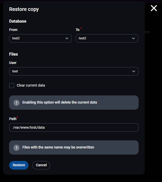 - Clear current data - da li da obriše trenutni sadržaj pre vraćanja backup-a