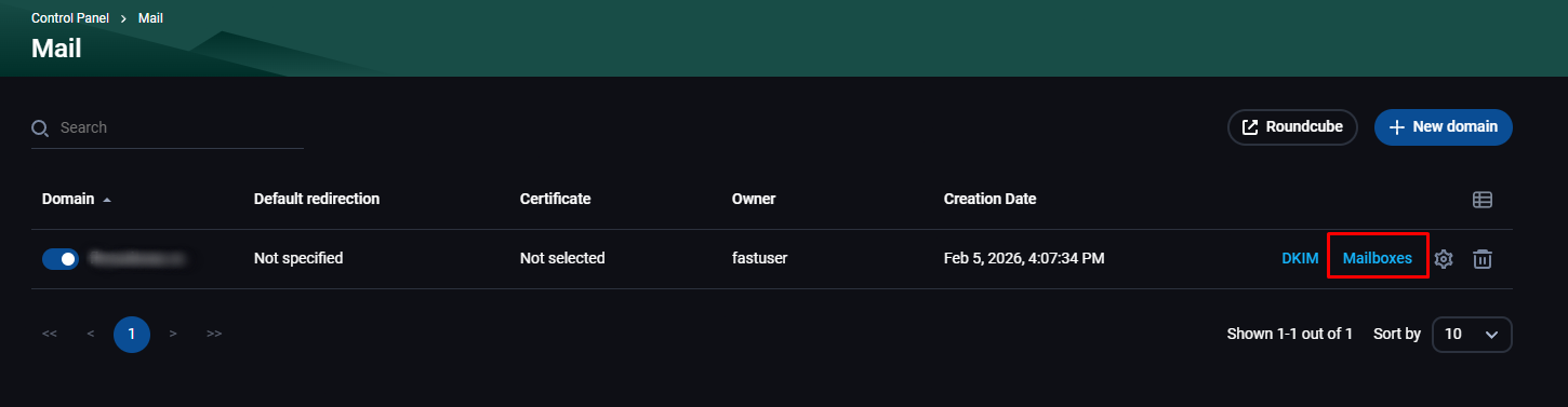Otvoriće se stranica gde će biti izlistani svi domeni na kojima postoje mailovi, kod željenog domena kliknite na dugme Mailboxes: