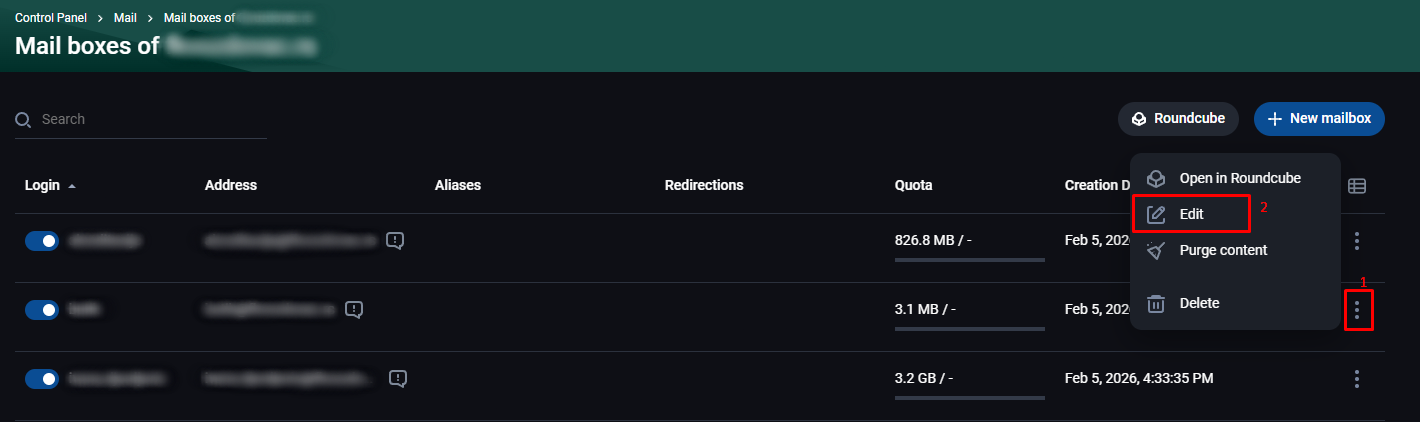 Otvoriće se stranica gde će biti prikazani svi mail nalozi na tom domenu. Sa desne strane željenog mail naloga kliknite na 3 tačke i potom na dugme Edit: